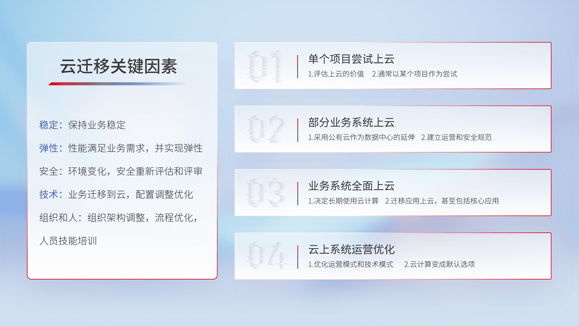 结合实际业务,,,从规划设计、、、云平台选型、、、、云原生改造、、、、数据迁移、、集成交付,,迁移全过程为客户识别最佳上云路径,,,做好风险识别管理,,,设计网络架构、、身份权限、、、、安全审计合规、、操作审计、、日志审计、、、、监控告警策略、、、、多站点容灾设计等,,,对云上基础设施进行整体规划,,,,提升IT治理水平,,,以满足弹性、、高可用、、、、高性能的需求。。
